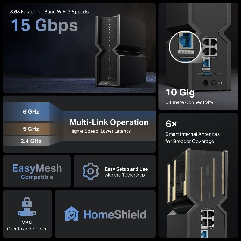 Router je plně kompatibilní s technologií EasyMesh, která umožňuje vytvořit jednotnou mesh síť s dalšími kompatibilními routery nebo extendery TP-Link. Přechod mezi jednotlivými uzly je zcela plynulý, bez výpadků a ručního přepínání. Bezpečnost domácí sítě zajišťuje služba TP-Link HomeShield s ochranou proti kybernetickým hrozbám, rodičovskou kontrolou a pokročilým filtrováním obsahu.