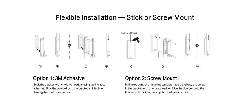 Instalace zvonku je jednoduchá a flexibilní. Lze ji provést pomocí samolepicí pásky 3M, šroubů nebo přiloženého montážního klínu pro optimální úhel záběru. Integrovaná baterie o kapacitě 5 200 mAh poskytuje výdrž až 180 dní na jedno nabití a díky konektoru USB-C je nabíjení rychlé a pohodlné. Pro maximální komfort je zvonek kompatibilní také s volitelnými solárními panely Tapo A200, A201 a A202, které zajistí bezúdržbový provoz. Díky krytí IP54 a odolnosti vůči teplotám od -20 °C do 45 °C je připraven spolehlivě fungovat i v náročných venkovních podmínkách.