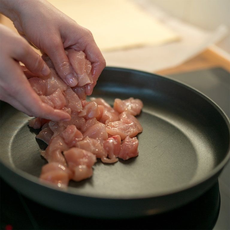 - Kousky kuřete krátce osmahněte na rozpáleném oleji.