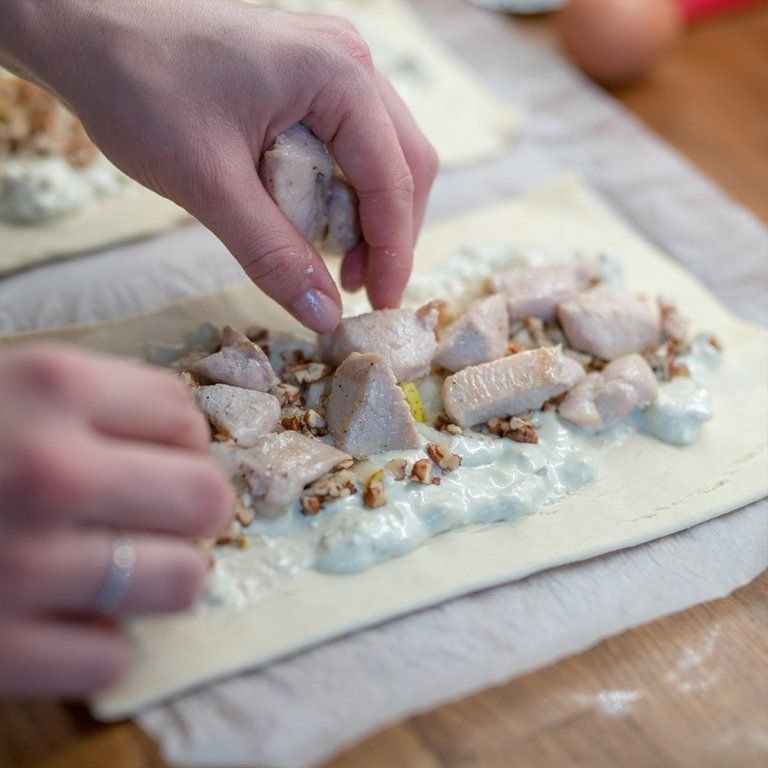 - Náplň osolte, opepřete a zaviňte do těsta.
