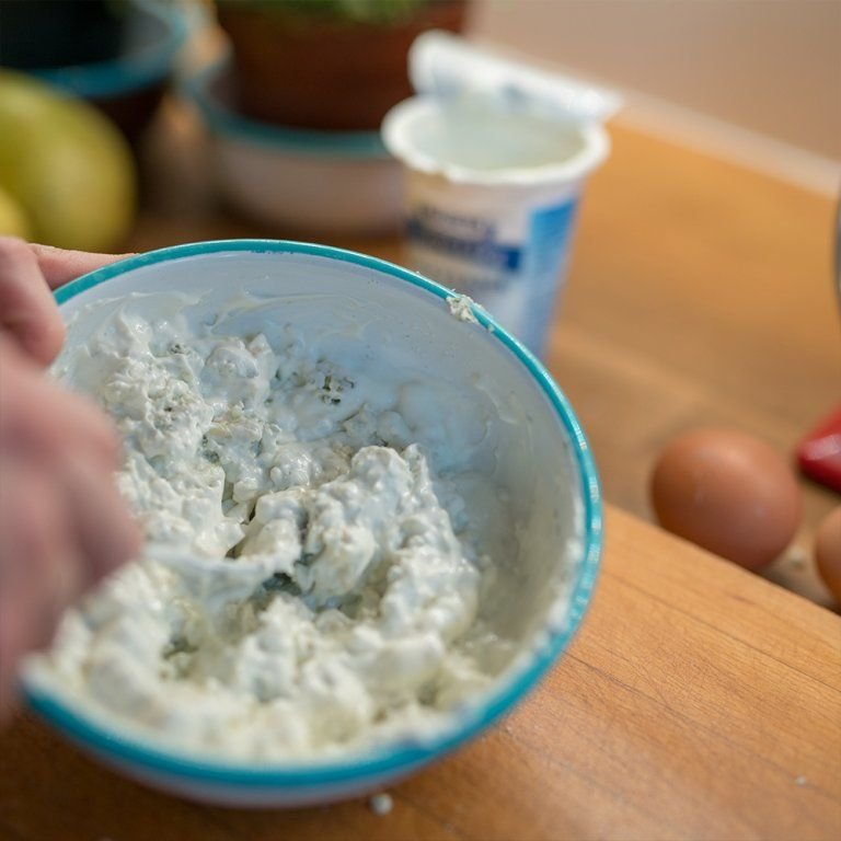 - Nivu rozmačkejte dohladka a smíchejte se zakysanou smetanou. Vmíchejte 1 vejce.