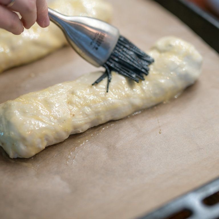 - Záviny položte na plech a potřete rozšlehaným vejcem.
