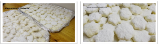 - Na hladkou moukou posypaném vále vyválíme plát cca 3 mm silný a vykrajovátkem vykrajujeme různé menší tvary.