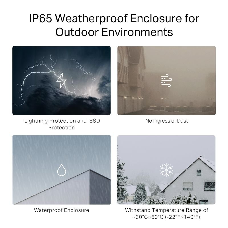 Jednotka je osazena odolným krytem s certifikací IP65, který chrání zařízení proti prachu, dešti i sněhu. Rozsah provozních teplot od -30 °C do 60 °C umožňuje celoroční provoz bez ohledu na klimatické podmínky. Moderní a nenápadný design zároveň zajistí, že zařízení neruší vzhled exteriéru.