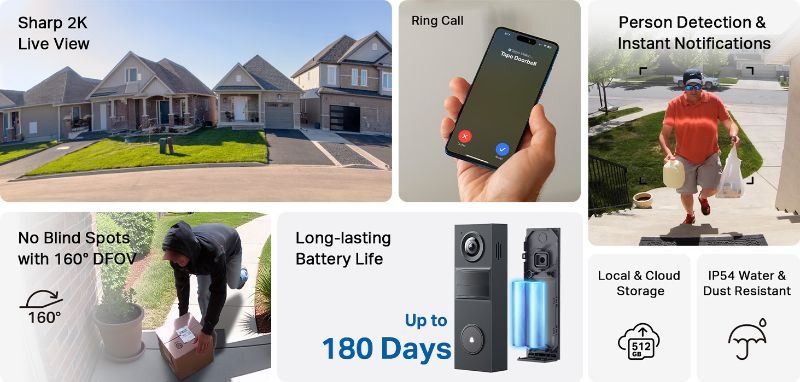 Tapo D205 dokáže zaznamenat video v rozlišení 2K (2304 × 1296 px), což zajišťuje detailní a přehledný obraz, ideální pro monitorování vstupu. Díky ultraširokému úhlu záběru 160° zvonek pokrývá celou postavu návštěvníka od hlavy až k patě. O kvalitní obraz se starají technologie 3DNR pro redukci šumu a WDR, která vyrovnává kontrast při náročných světelných podmínkách. Samozřejmostí je také noční vidění pomocí dvou infračervených LED diod s dosahem až 7,6 metru a 10× digitální zoom.