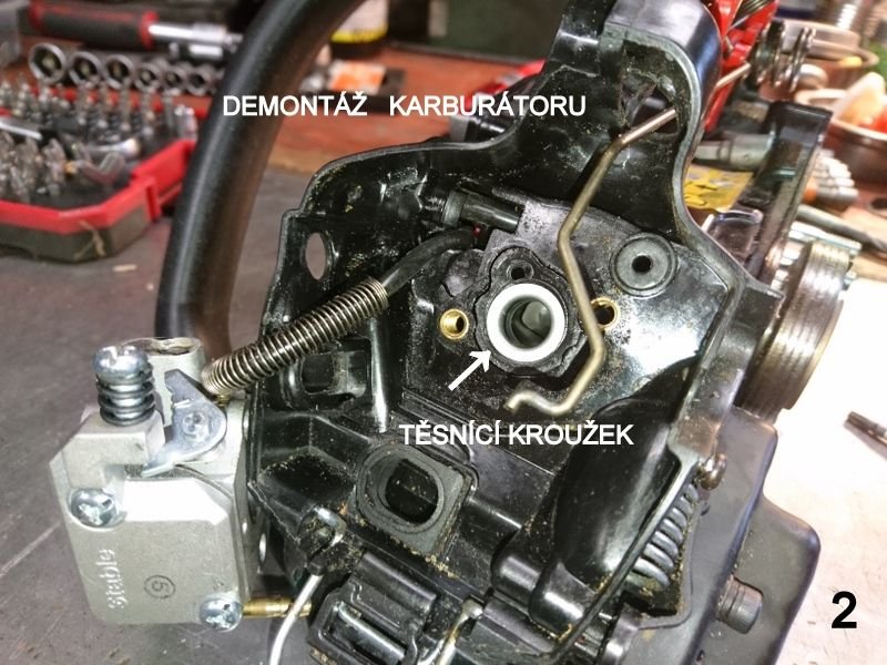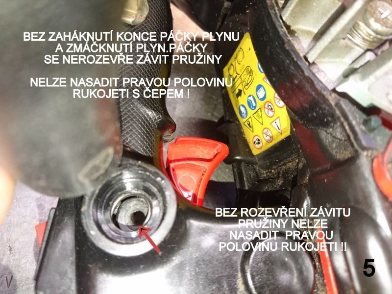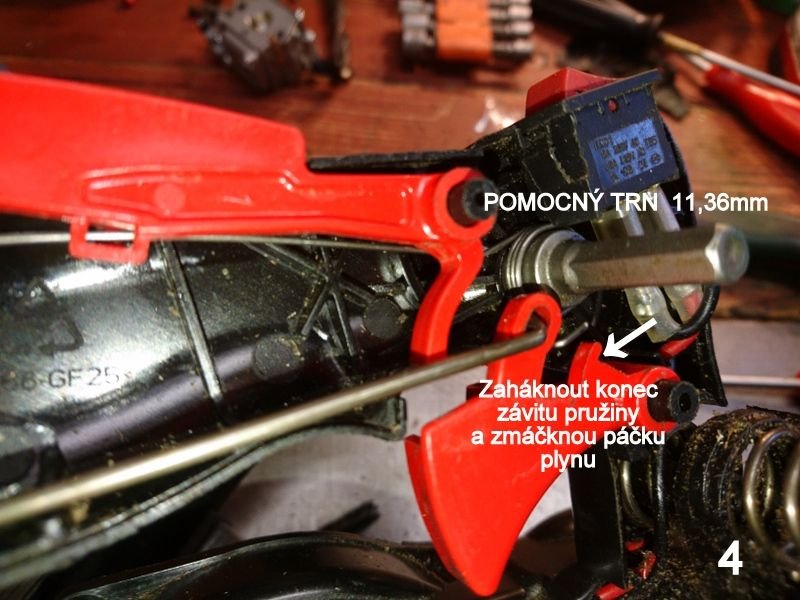 Protože jsem neměl ponětí o původní poloze součástí plynu (zejména pružiny aretace), kvůli pohodlí jsem vysadil i karburátor (neztratit těsnící kovové komponenty sání). Při několikerém pokusu o sesazení jsem zřejmě z důvodu nezaháknutí konce pružinky do páčku plynu a její zmáčkutí, nebyl schopen při složení překonat vsazení pružinky na čep v pravé polovině rukojeti. Došlo u ulomení aretačního jazýčku konce pružiny v levé polovině rukojeti. Vyřešeno nažhavením konce pružinky a propíchnutím žebírka v levé rukojeti (obr.3). Po několikerém bezúspěšném pokusu jsem otočil pružinku závitem ke karburátoru - aretace plynu a její funkčnost zachována. Po osazení karburátoru, pružina klapky karburátoru vyvíjí dostatečný tah na vrácení plynové páčky do základní polohy. Složení je v opačném pořadí demontáže.