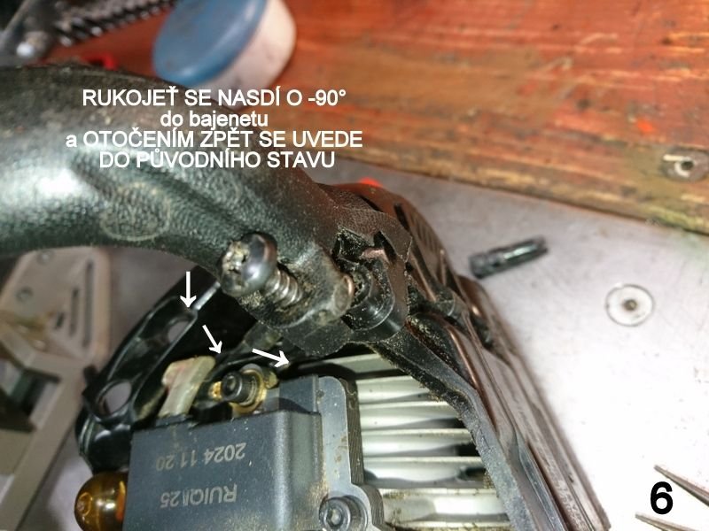 Po necelém 1. roce používání pilky vypověděl službu STOP vypínač. Kdybych věděl dříve absurdní řešení komponent plynu v rukojeti a nesmyslné bajonetové fixace dílů, tak bych nemusel rozebrat celou mašinku. Připomenu, co do skladby jde o jeden z nejnesmyslnějších pokusů v jinak dobrém nápadu. Českému technikovi zůstává rozum stát nad absurditou řešení komponent v rukojeti: Například čepy páček jsou v levé polovině rukojeti, ale čep pružinky aretace (blokování) páčku plynu je v pravé polovině rukojeti. A to krkolomné nasazování dílů!!