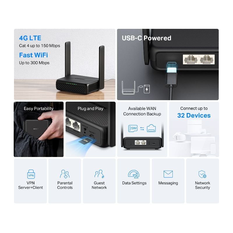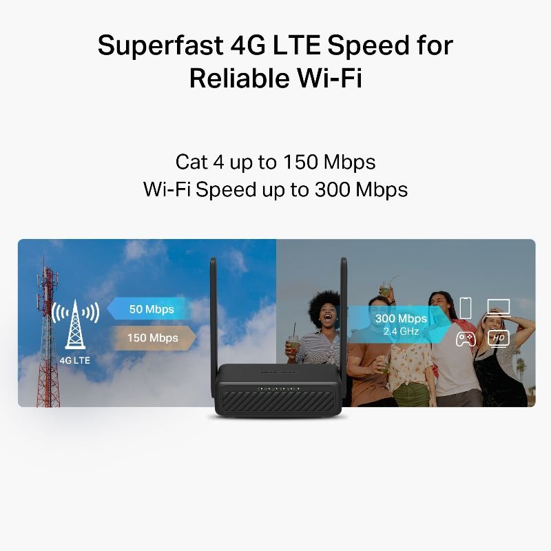 Router využívá technologii 4G LTE Cat4, která umožňuje rychlost stahování až 150 Mb/s a odesílání až 50 Mb/s. Díky tomu poskytuje dostatečný výkon pro běžné online aktivity, jako je prohlížení webu, streamování videí, videohovory nebo práce na dálku. Zařízení zároveň vytváří bezdrátovou síť v pásmu 2,4 GHz s maximální rychlostí až 300 Mb/s, která zajišťuje stabilní sdílení mobilního připojení mezi více zařízeními.