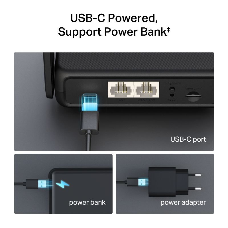 MB113-4G je napájen prostřednictvím USB-C portu, což umožňuje jeho provoz nejen z běžného napájecího adaptéru, ale také z powerbanky. Díky tomu mohou uživatelé router používat i v místech bez elektrické zásuvky, například při cestování nebo venkovních aktivitách.